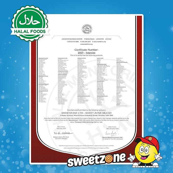 Sugar, Glucose Syrup, Water, Gelling Agents: Beef Gelatine (Halal), Pectin, Modified Potato Starch, Acid: Citric Acid, Lactic Acid, Flavourings, Colours: E133, E171, Glazing Agent: Carnauba Wax