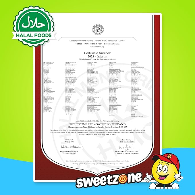 Glucose Syrup, Sugar, Water, Beef Gelatine (Halal), Modified Potato Starch, Acids (E296, E270, E330), Flavourings, Glazing Agents (Vegetable Oil (PALM)), Colours (E100, E129, E133)