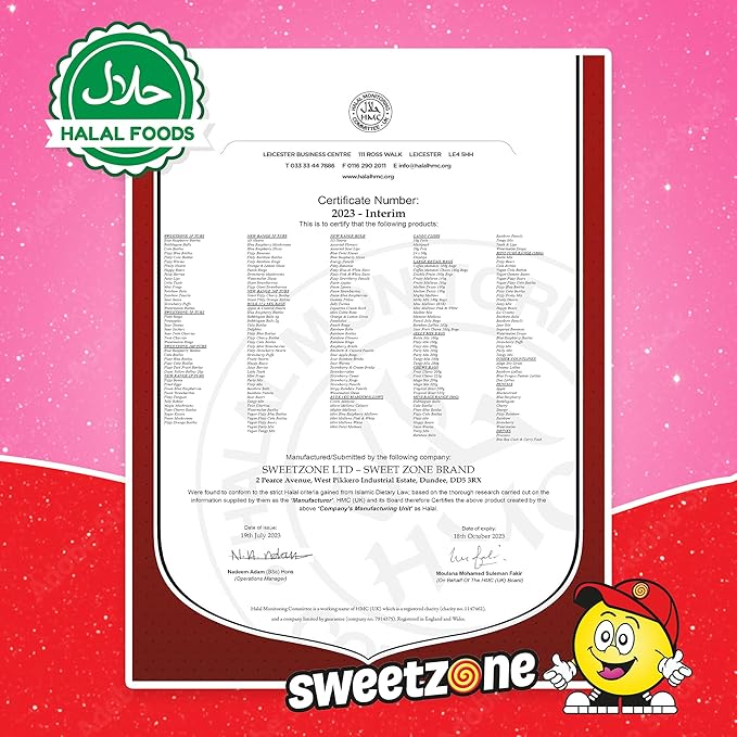 Sugar, Glucose-Fructose Syrup, Vegetable Fat (PALM), Potato Strach, Humectant (E422), Beef Gelatine (Halal), Acids (E334), Flavourings, Colours (E150C, E100, E163, E160, E133, Glazing Agents (Vegetable Oil (PALM))