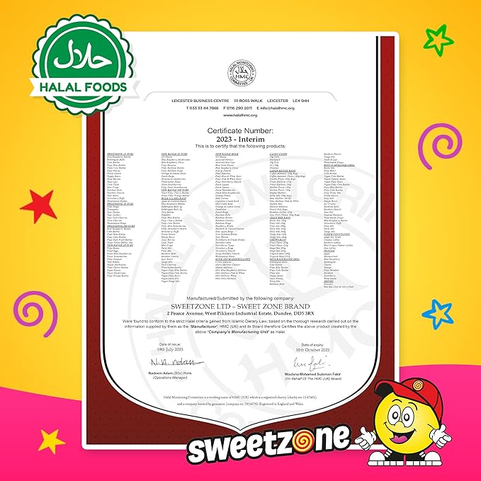 Glucose Syrup, Sugar, Beef Gelatine (Halal), Citric Acid, Fruit Juices (Apple / Strawberry) (2%), Glazing Agents (Carnauba Wax, Beeswax), Flavourings, Colours (E100, E163, E141, E133, E150a, E160iii, E104, E102, E122)