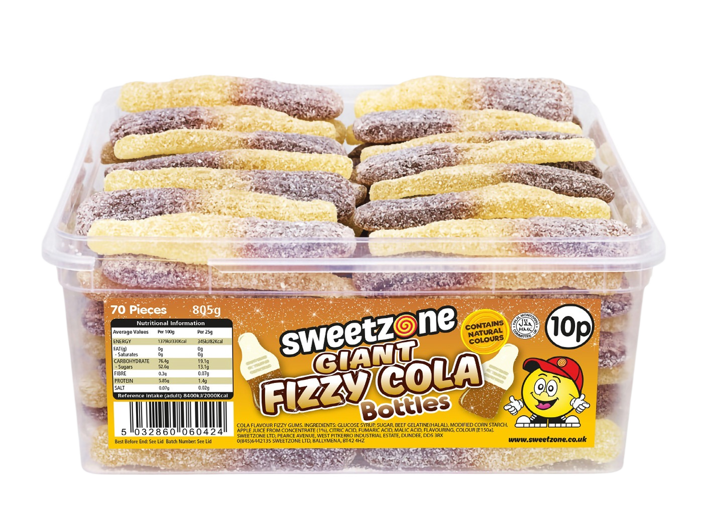 Glucose Syrup, Sugar, Water, Beef Gelatine (Halal), Modified Potato Starch, Acid: Citric Acid, Lactic Acid, Flavourings, Glazing Agents: Beeswax, Carnauba Wax, Colours: E100, E129
